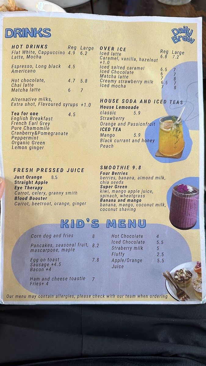 Kid's Menu features simpler food and drink options suitable for younger guests, such as Corn Dog and Fries, Hot Chocolate, Iced Chocolate, Strawberry Milk, Fluffy, Egg on Toast, Apple, Juice, and Ham and Cheese Toastie.